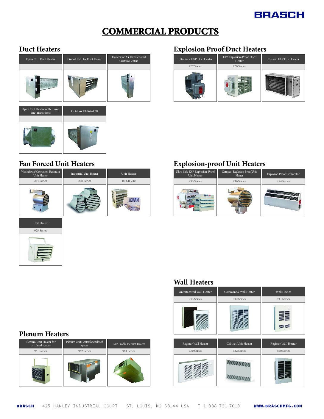 Brasch Manufacturing is a long established leader in the design and manufacture of electric comfort heating equipment and controls aimed at the commercial, industrial and institutional marketplace. We also supply heating equipment to most air handling equipment manufacturers with lead times tailored to meet OEM production schedules. Our heating products are custom designed, built to exact specification and must endure stringent quality control testing. Premium shipment of custom open coil electric heaters can be accomplished in as few as two working days. Please review our electric heating capability brochures.